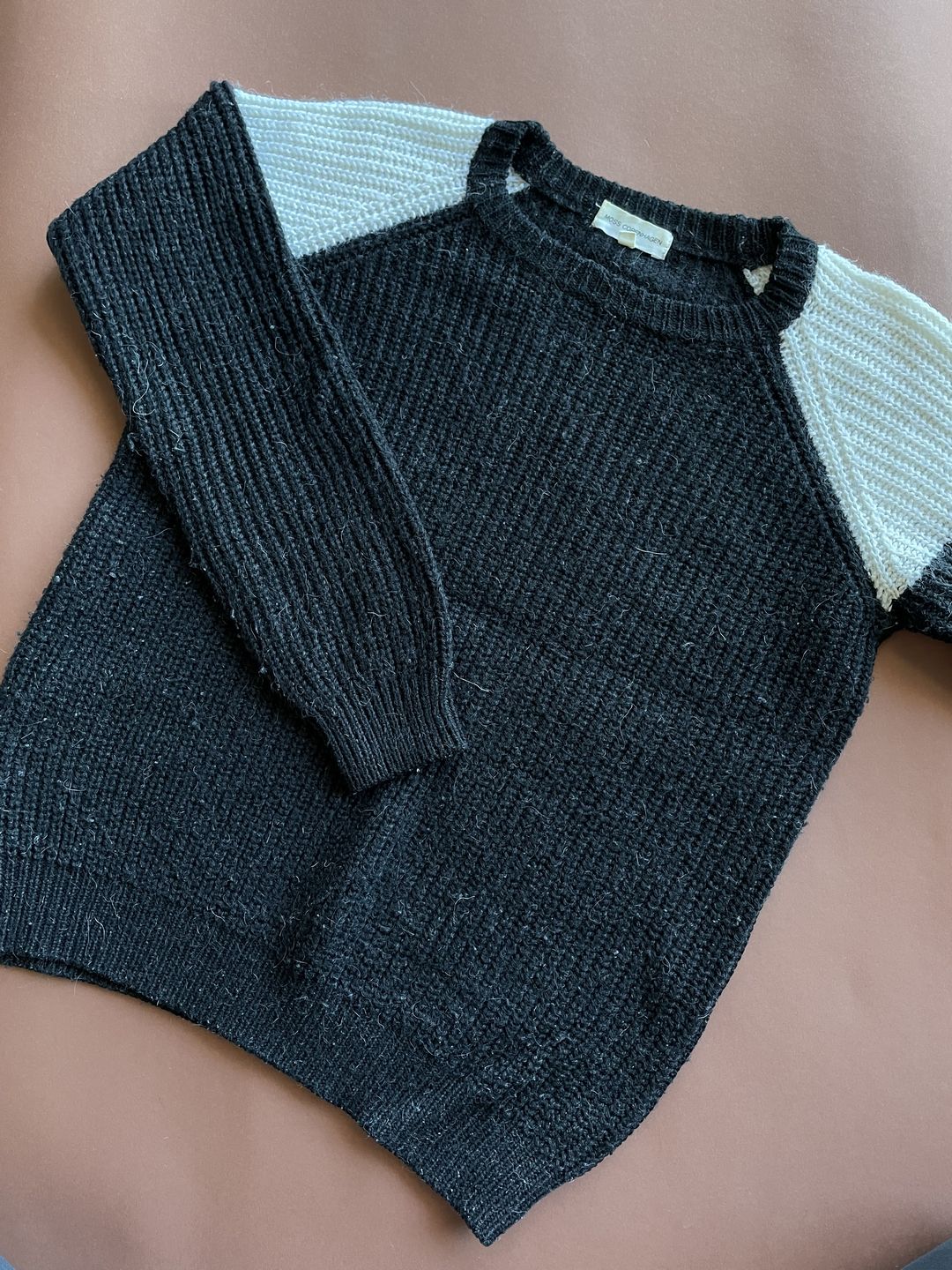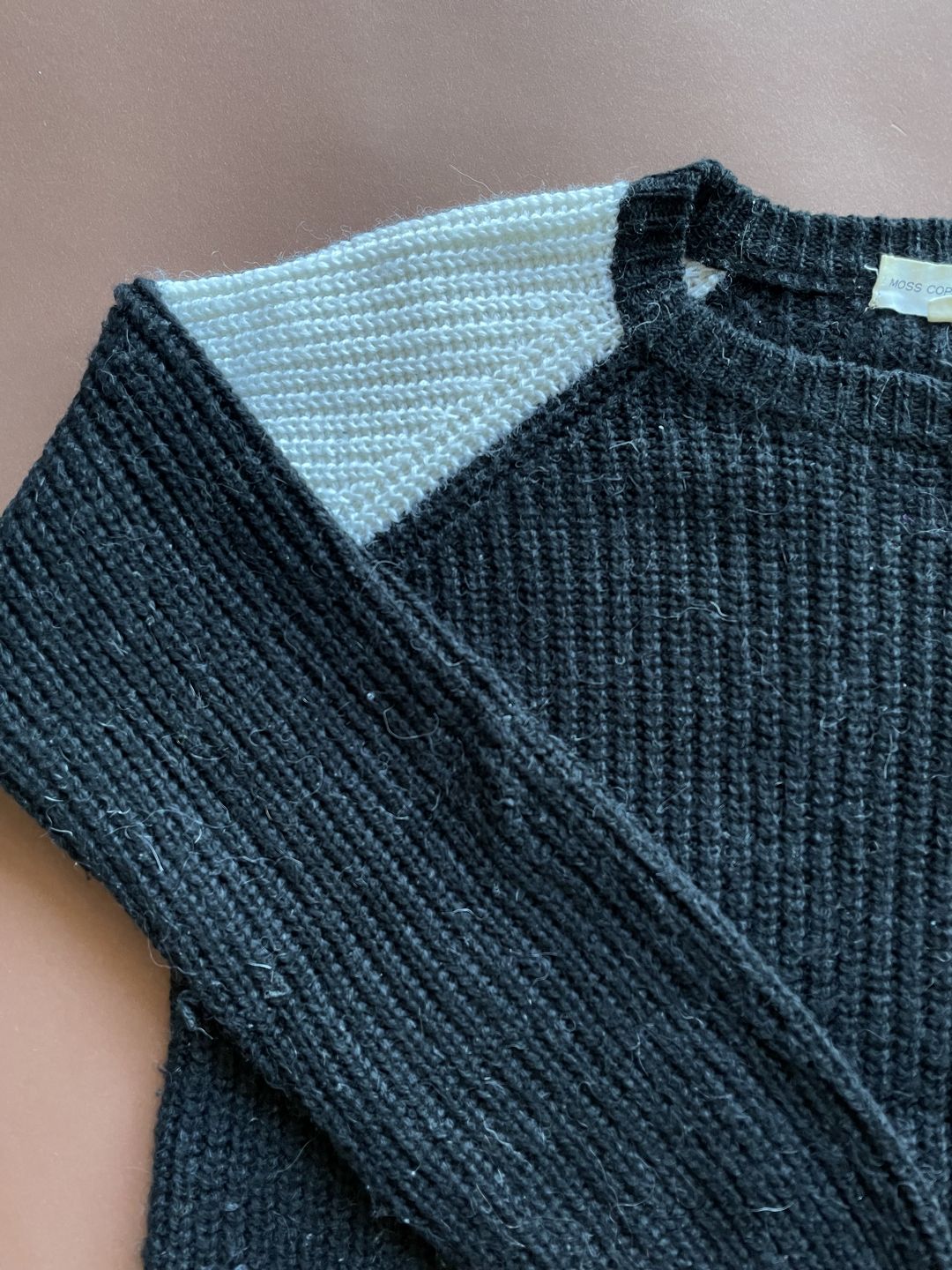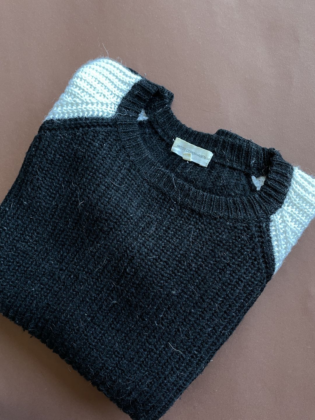 Damski dwukolorowy sweter w rozmiarze XS, firmy Moss Copenhagen. Materiał prążkowany, krój prosty bez wcięć w talii, wykończony ściagaczem.
